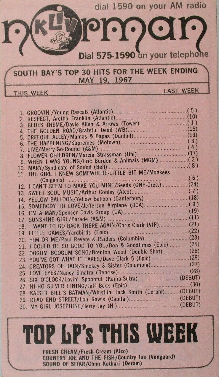 For The Week Ending May 19, 1967 1. The Young Rascals - Groovin' 2. Aretha Franklin - Respect 3. The Arrows Featuring Davie Allan - Blue's Theme 4. The Grateful Dead - The Golden Road (To Unlimited Devotion) 5. The Mamas & The Papas - Creeque Alley 6. The Supremes - The Happening 7. The Merry-Go-Round - Live 8. Marcia Strassman - The Flower Children 9. Eric Burdon & The Animals - When I Was Young 10. Syndicate of Sound - Mary … (click here to view all chart data)